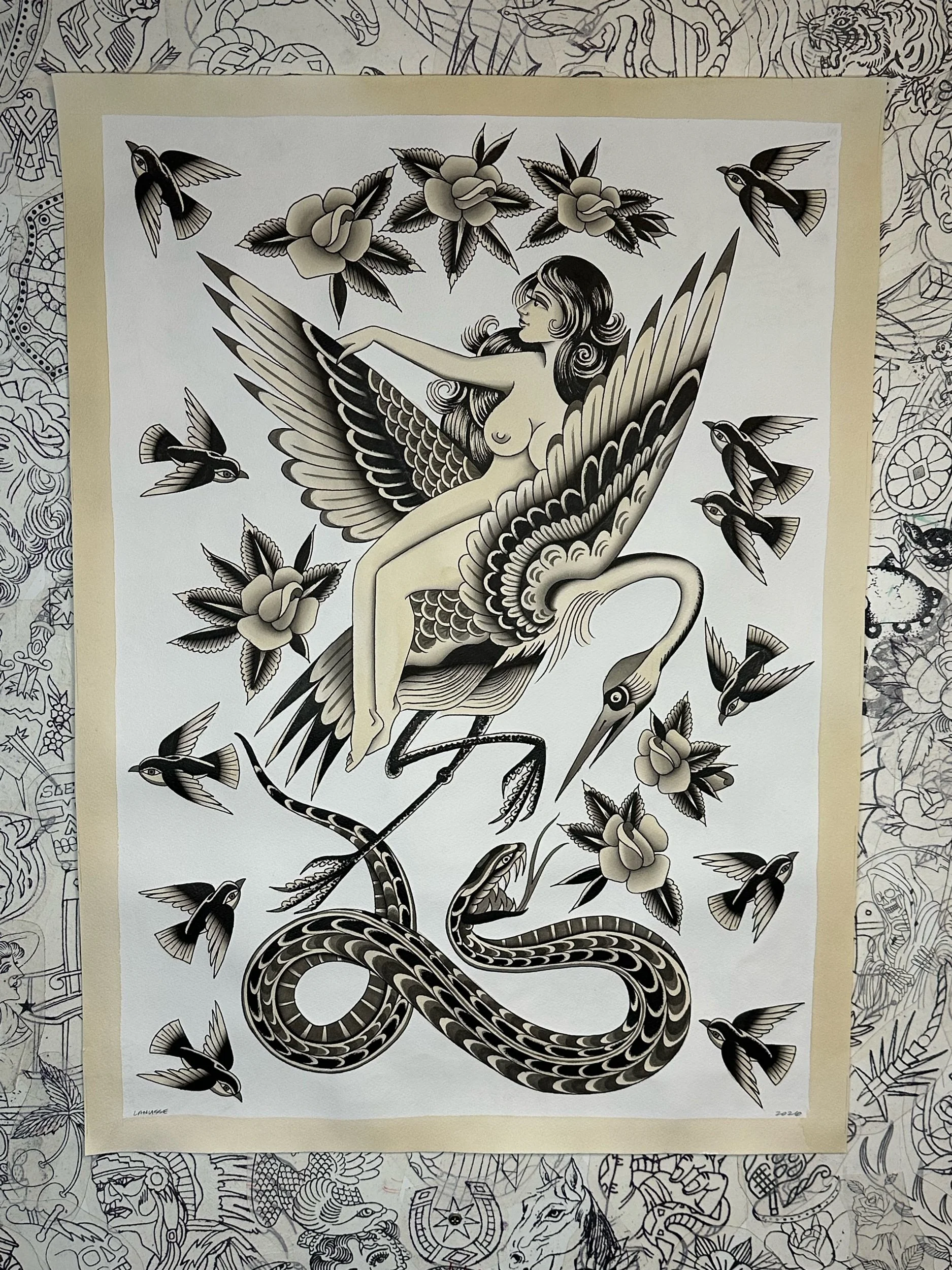 18”x24” printed on heavyweight watercolor paper with archival inks. This painting is a study for a full back piece layout of a black and grey tattoo.