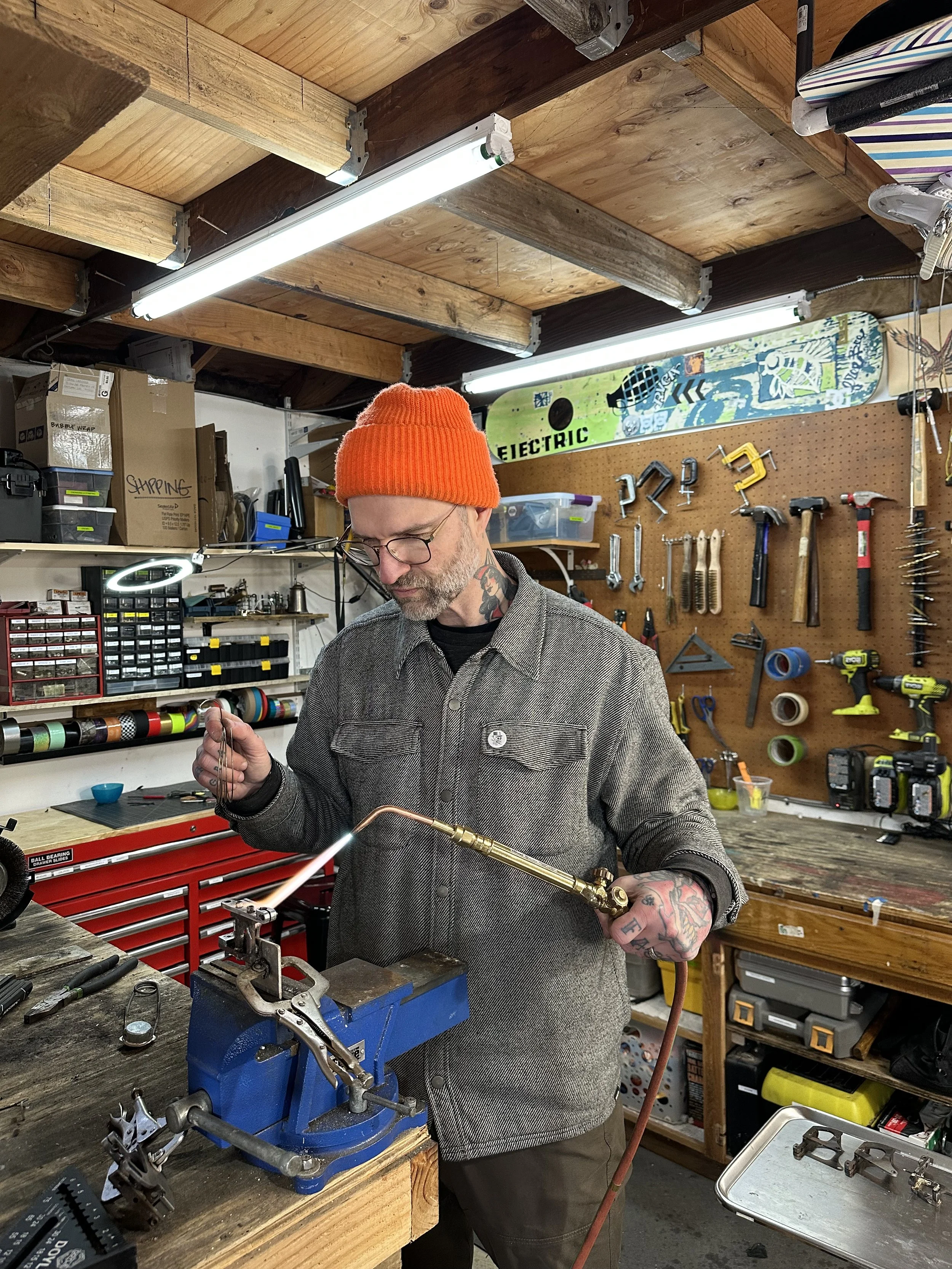 Man standing in a cluttered workshop with various tools, equipment, and supplies on the wooden workbenches and pegboards behind him, holding a small object and smiling at the camera.