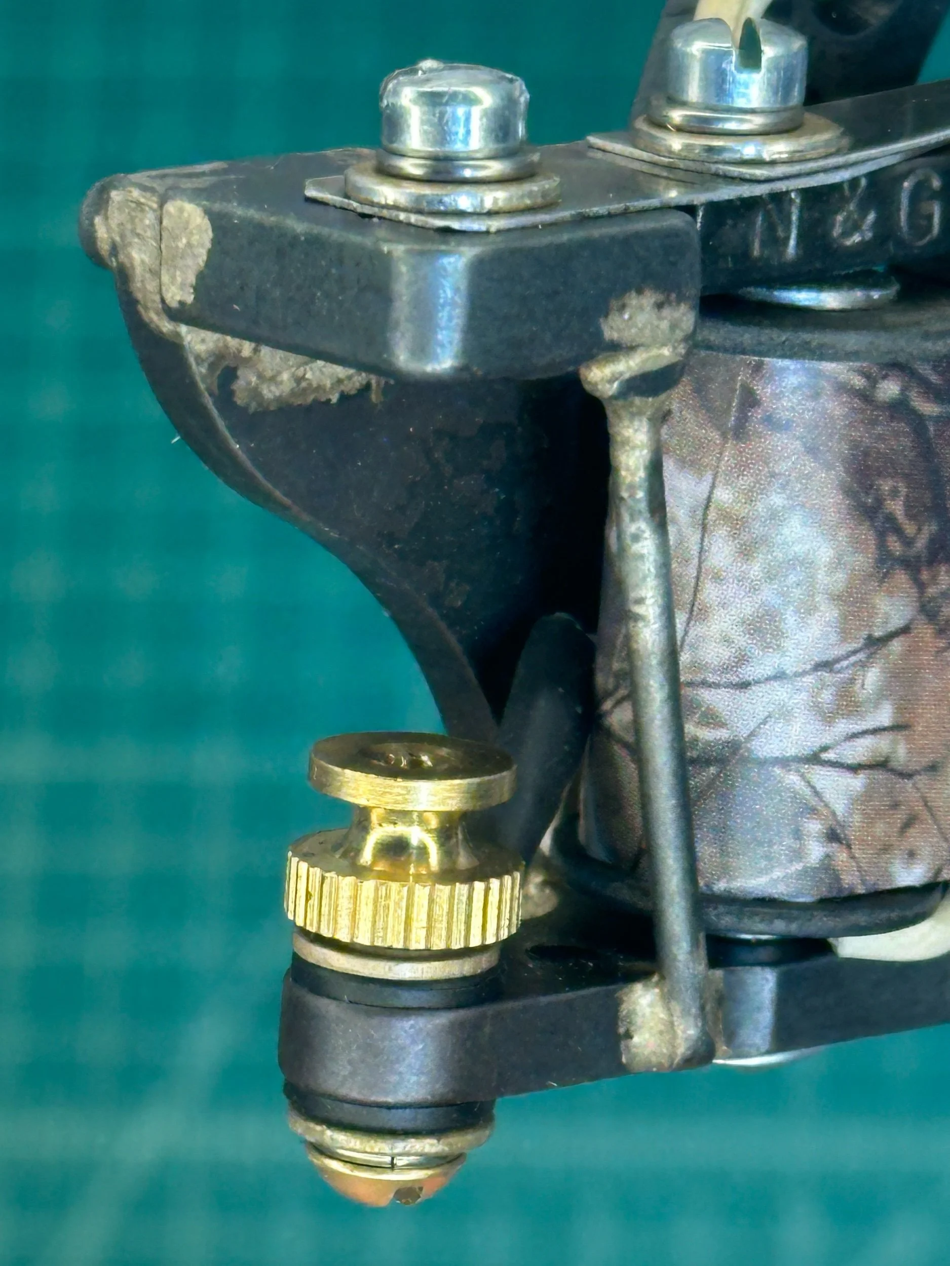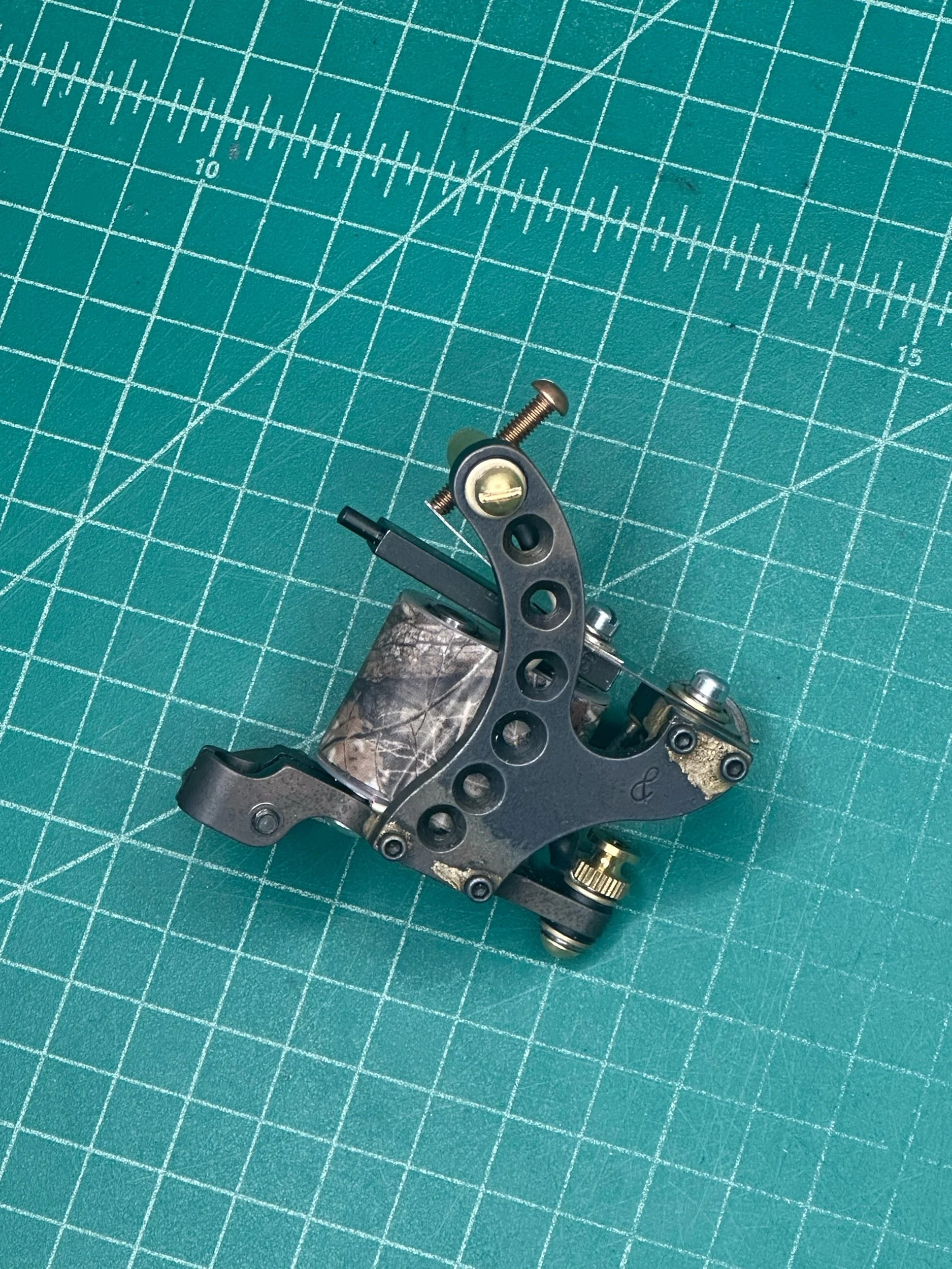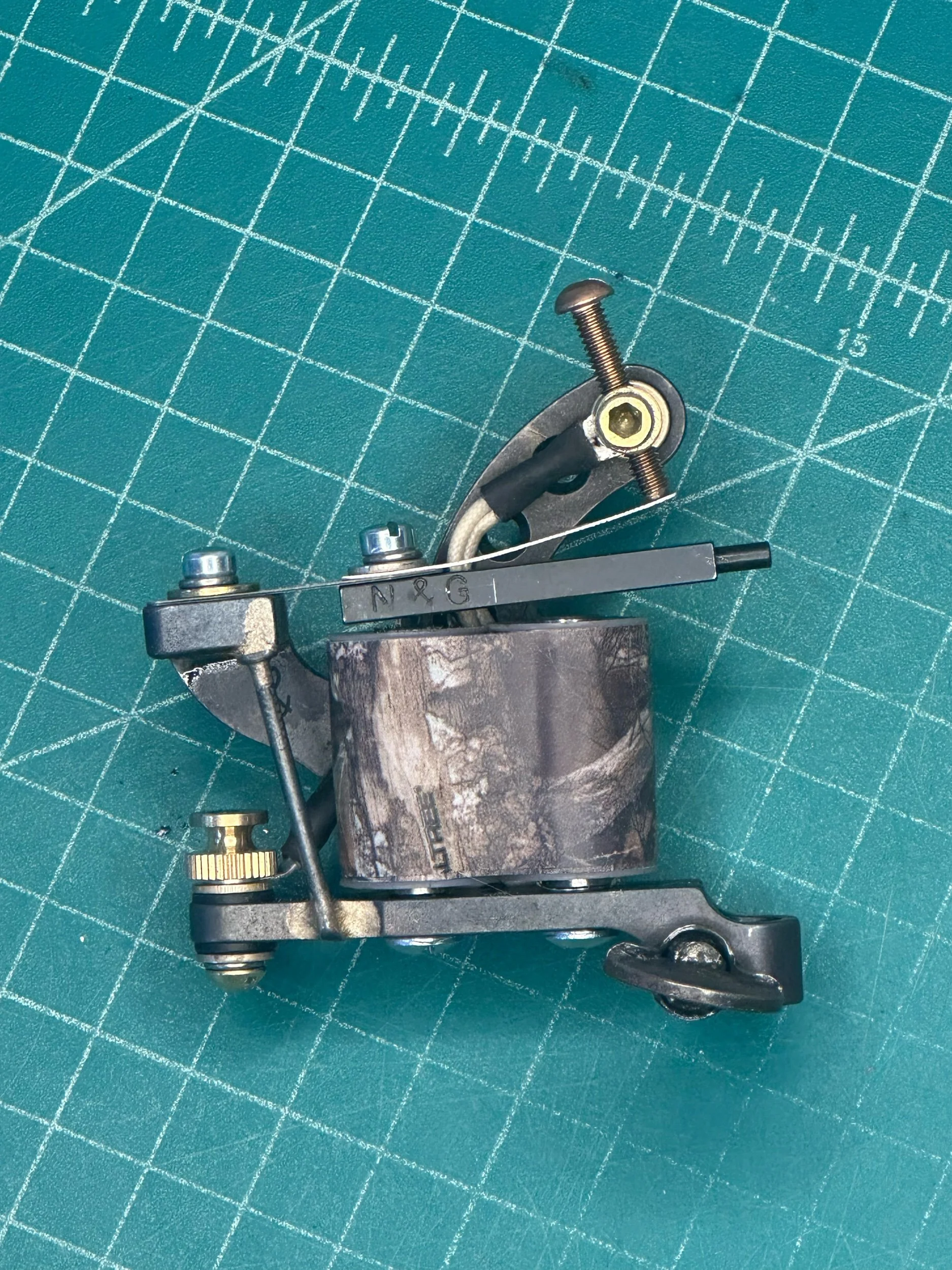 These three piece Coleman style machines are designed to do the heavy lifting in your day to day tattooing. The liner runs at 130cps and is punch enough to run big groupings. The shader is a dream for packing color and traditional whip shading. Both are heat treated and oil dipped with handmade brass hardware and feature real tree camo coils.